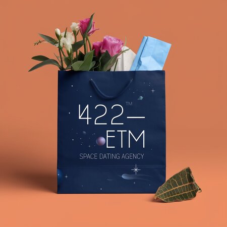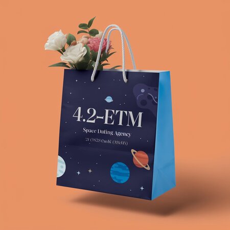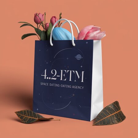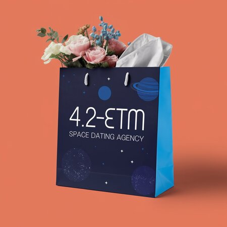 Prompt: create a branded shopping bag design for the space dating agency «4.2-etm» with the name in RS125 font. The design should be minimalist, using a color palette of deep blue (#1F3B73), dark blue (#193559), sky blue (#224573), light blue (#C2D7F2), and white (#F2F2F2). Incorporate subtle cosmic elements like stars, planets, or abstract space textures, while maintaining a sleek, futuristic look. The bag should convey the theme of intergalactic connections and space exploration, with a modern and elegant feel.