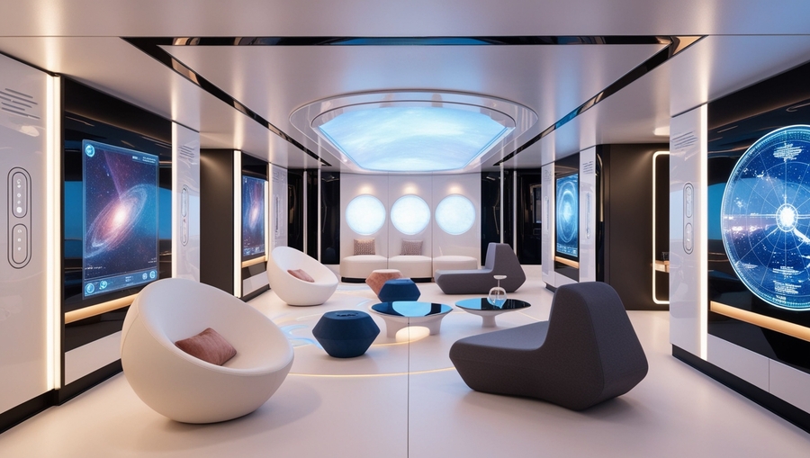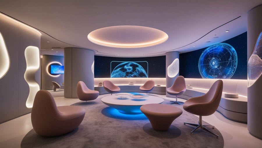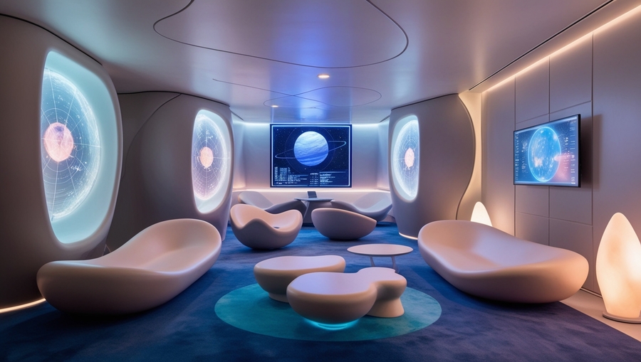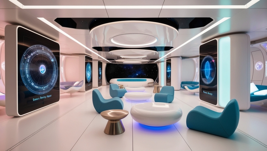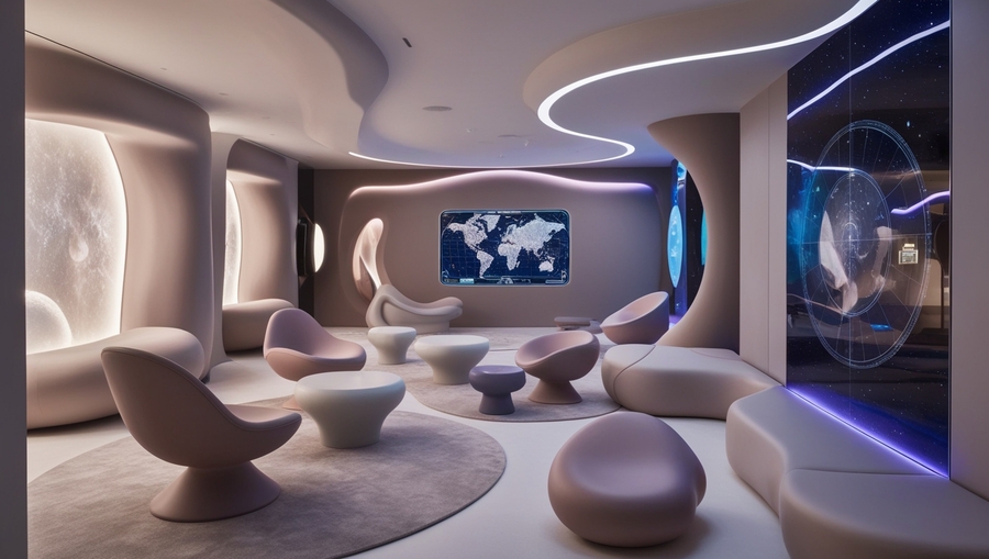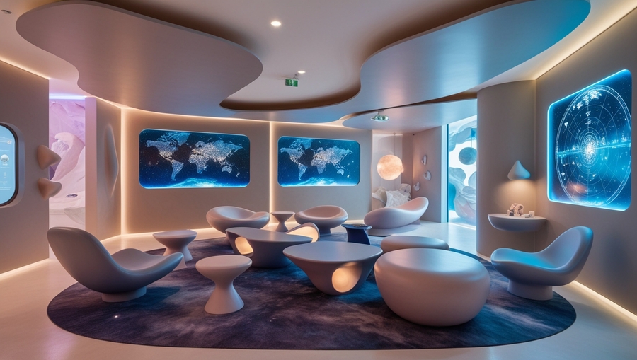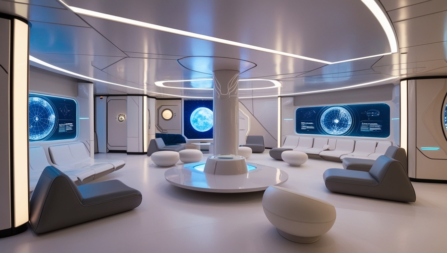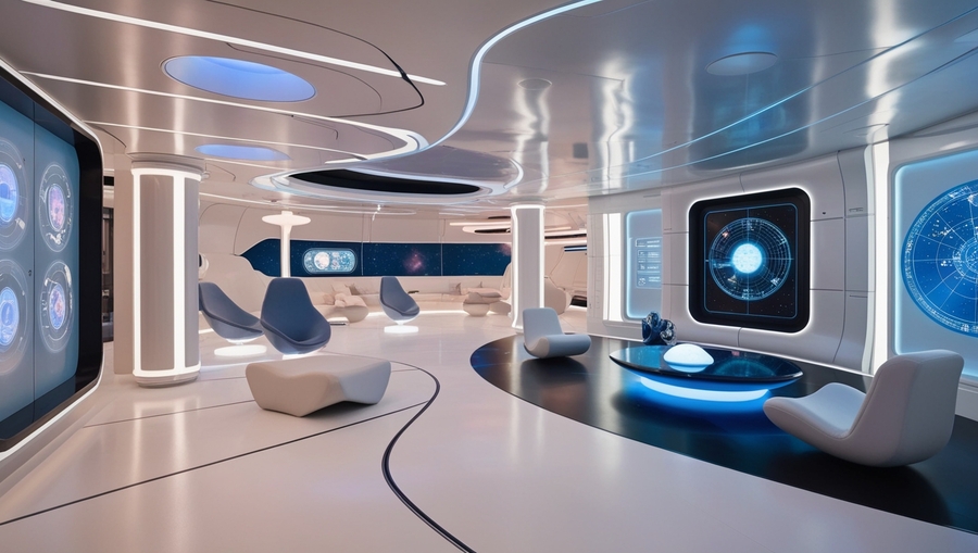 Prompt: design the interior of a futuristic space station for a space dating agency. The space should feel sleek, modern, and otherworldly, with high-tech elements like glowing panels, holographic displays, and interactive surfaces. Focus on open, minimalist spaces with soft ambient lighting and futuristic furniture, such as floating chairs or modular lounges. Incorporate subtle cosmic motifs, like star maps or holographic projections, to emphasize the theme of intergalactic connections. The overall atmosphere should be cutting-edge and inviting, creating a sense of possibility for connections across the universe.