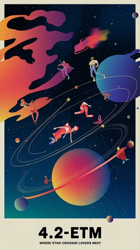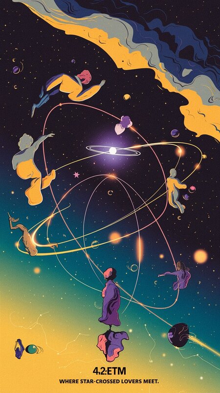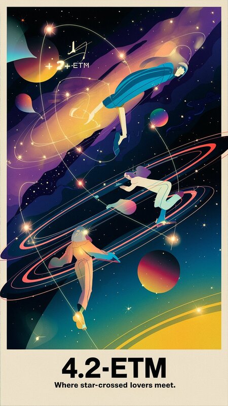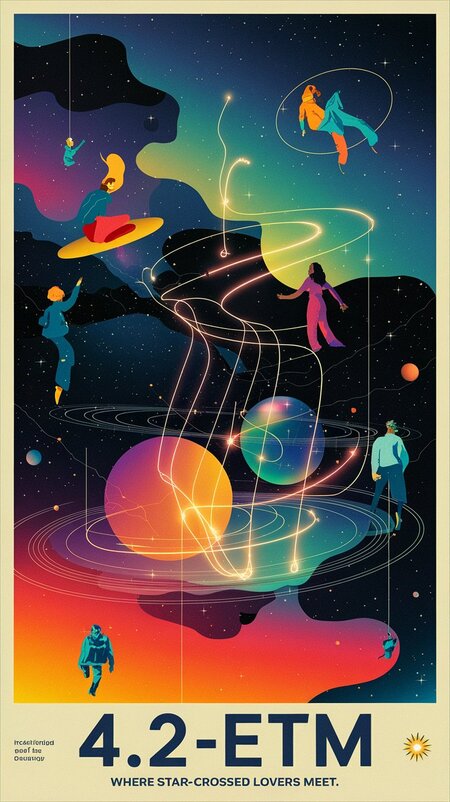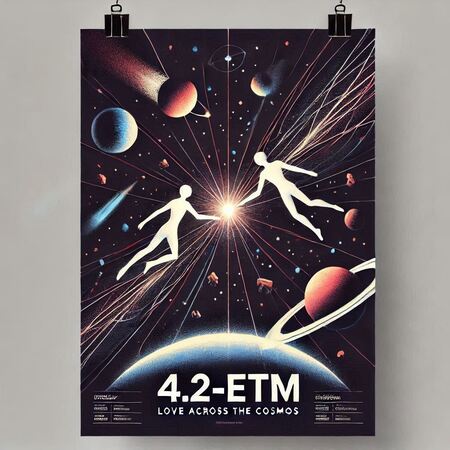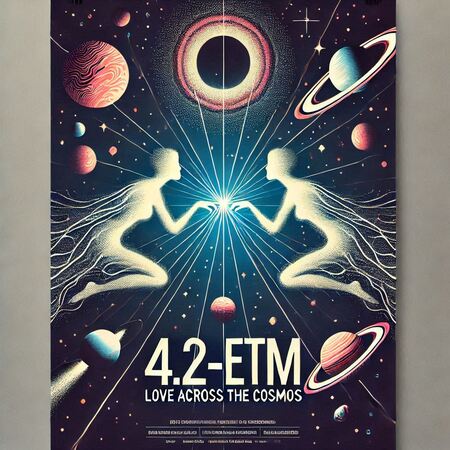Prompt: create a surreal poster mock up for «4.2-etm» in simple graphic style featuring two abstract figures connected by light beams or cosmic energy in deep space. Add floating elements like asteroids, comets, and stars to enhance the otherworldly feel. Include the «4.2-etm» logo and the tagline «Love Across the Cosmos.» The design should evoke mystery, wonder, and infinite possibilities in space relationships.