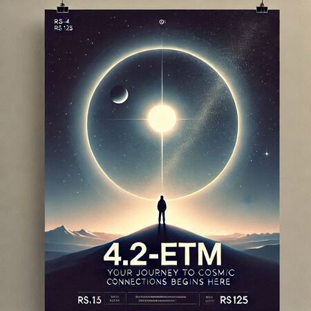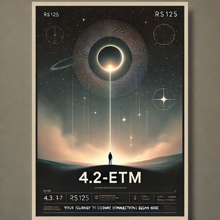 Prompt: design an elegant, modern poster for «4.2-etm» featuring a minimalist space landscape. The poster should show a figure gazing at a distant star or planet, symbolizing hope and connection. The background should feature subtle cosmic textures with soft, ambient light effects. The logo «4.2-etm» in RS125 font should be placed at the top, with the tagline «Your Journey to Cosmic Connections Begins Here.» The overall aesthetic should feel calming yet inspiring, blending the vastness of space with the intimacy of personal connections.