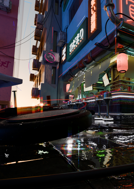 Мир, где технологии достигли пика, но нищета и хаос остаются неотъемлемой частью городской жизни. В центре сцены — небольшой двор с азиатским кафе, окружённый высотными зданиями, после дождя. Контраст между неоновым сиянием и запущенностью пространства передаёт дух киберпанка, где реальность балансирует между прогрессом и упадком.