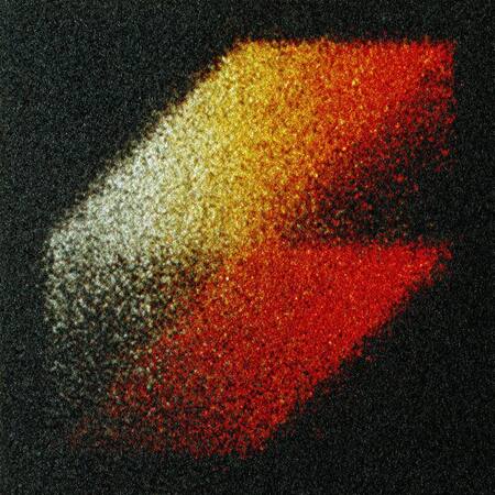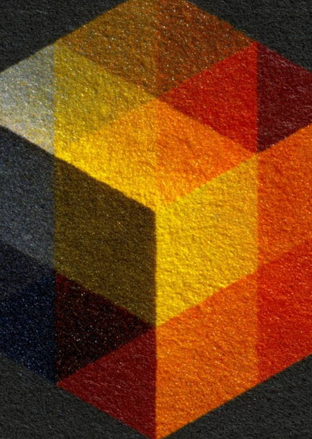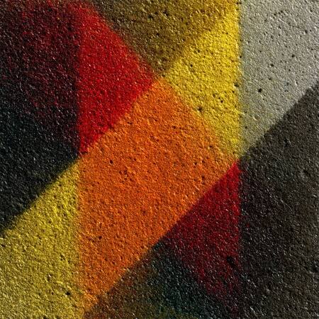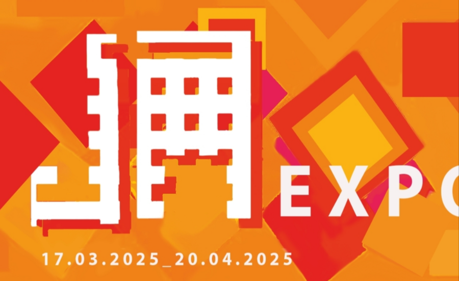 Create a minimalistic logo for the exhibition space based on Joseph Albert’s design. Use bright orange, yellow, and red colors with a gradient. Add a grainy texture