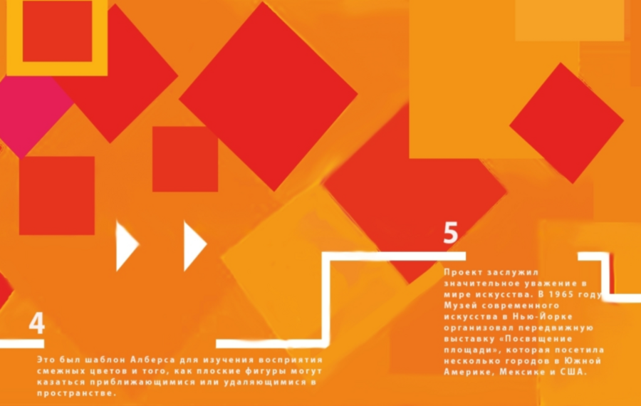 Описание для гостей: «Добро пожаловать в место, где цвет обретает голос, а форма играет с вашим воображением. Мы создали среду, вдохновленную революционными идеями Джозеф Альберса, где искусство выходит за рамки холста. Здесь вы не просто зритель — вы участник. Прикоснитесь к инсталляциям, измените точку зрения и откройте для себя, как один цвет может звучать по-разному в зависимости от его окружения. Наш дружелюбный персонал всегда готов стать вашим проводником в этом захватывающем путешествии по миру визуальных открытий. Это пространство для всех: для детей, впервые узнающих магию цвета, и для взрослых, желающих глубже понять язык искусства»