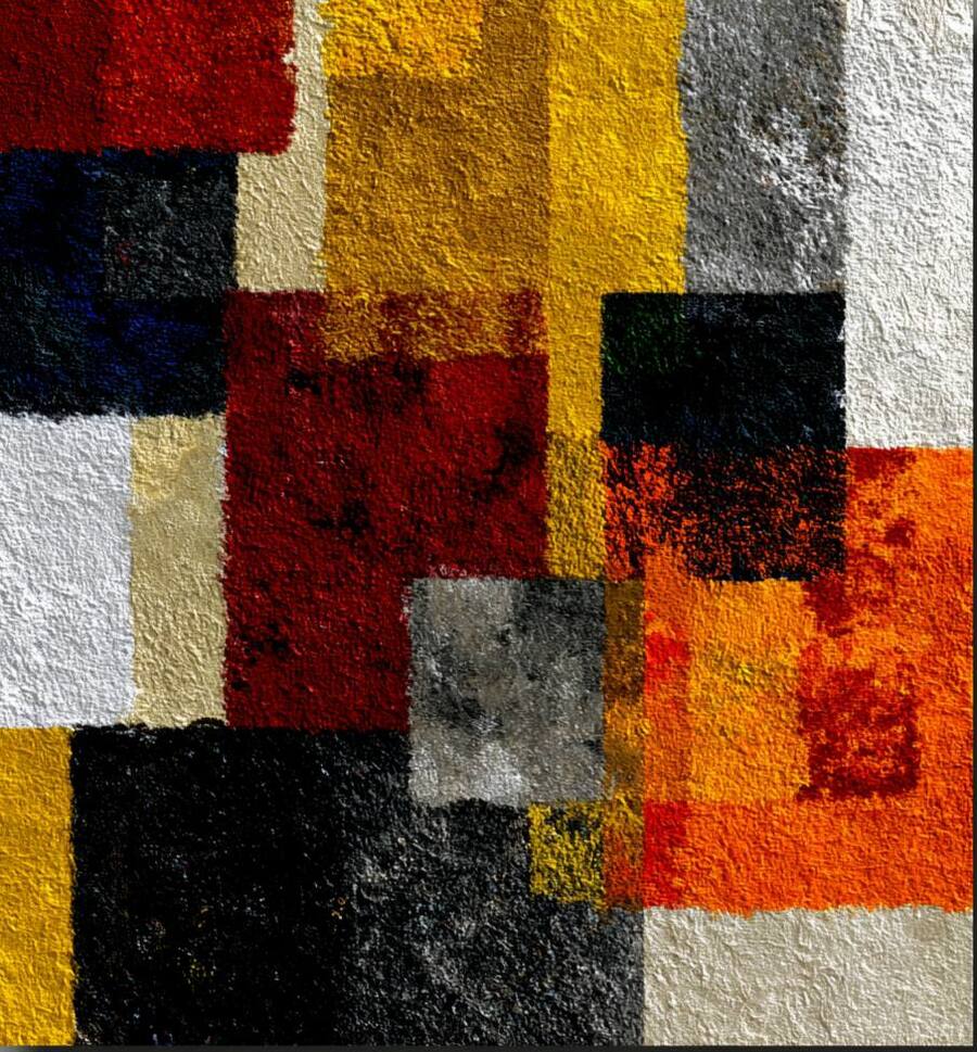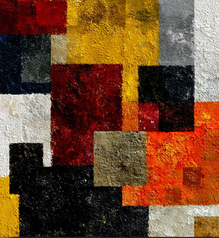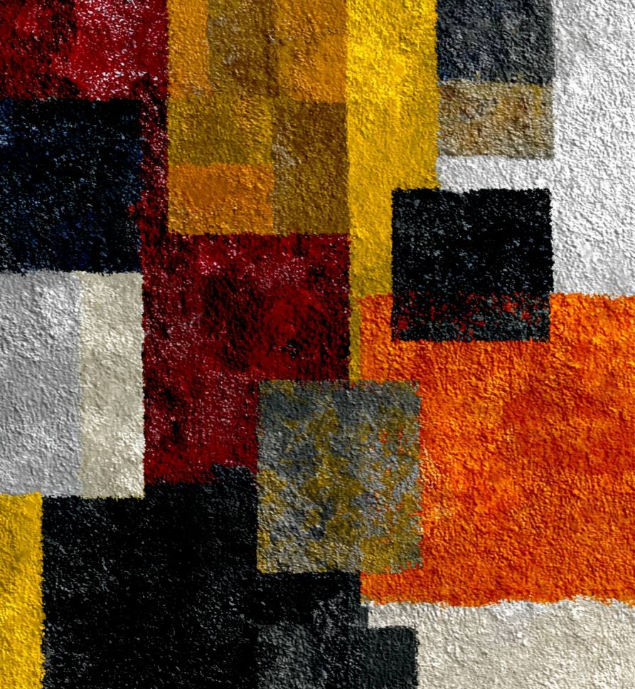 Create posters in the style of Joseph Albers. The colors in the posters should be black, bright orange, bright yellow, and bright red, as well as white. These posters should be part of the Joseph Albers exhibition and encourage people to visit the exhibition. Add a grainy texture. Include text on the posters. The objects on the posters should be clear and square. Just like Joseph Albers' paintings.