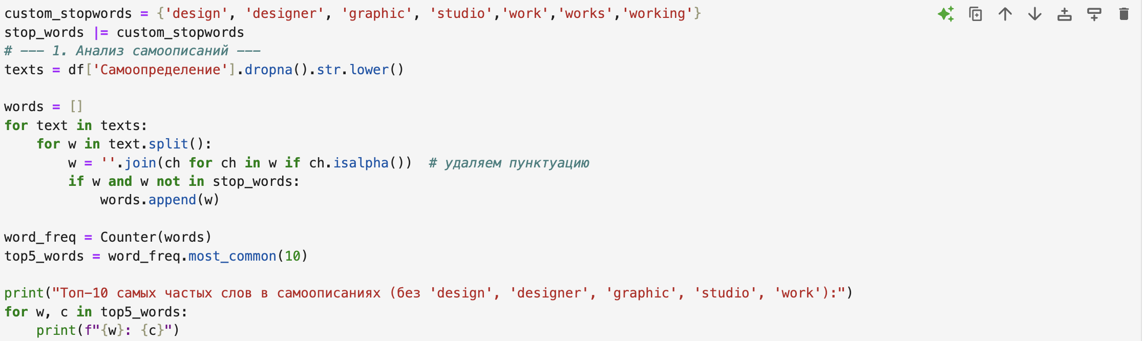 Анализ текстов с сайтов-портфолио выявил десять наиболее часто встречающихся слов (исключая термины, напрямую описывающие профессию: «design», «designer», «graphic», «studio», «work»)