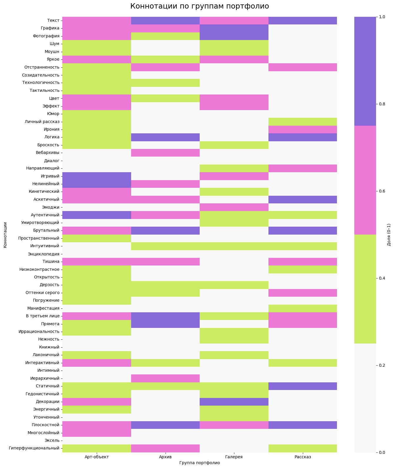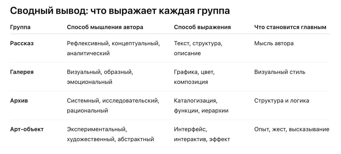 Тепловая карта позволила выявить распределение смысловых коннотаций внутри четырёх типов портфолио: «Рассказ», «Галерея», «Архив» и «Арт-объект». Эта визуализация приближает к пониманию того, каким образом каждая группа выстраивает идентичность автора и какие когнитивные установки лежат в её основе.