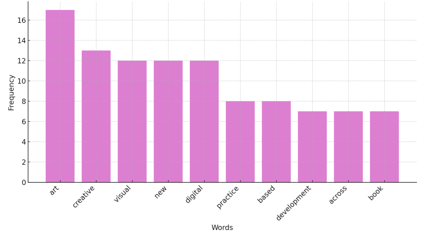 art (17), creative (13), visual (12), new (12), digital (12), practice (8), based (8), development (7), across (7), book (7).