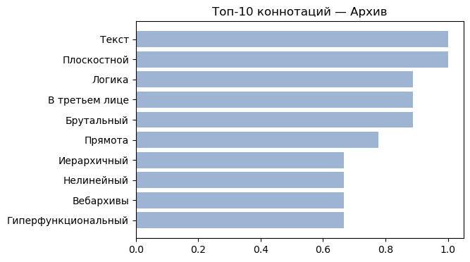 Основные наблюдения Высокая частотность коннотаций: «логика» — 9 из 10, «в третьем лице» — 9 из 10, «брутальный», «иерархичный», «прямота». Средняя частотность коннотаций: «веб-архивный», «гиперфункциональность».