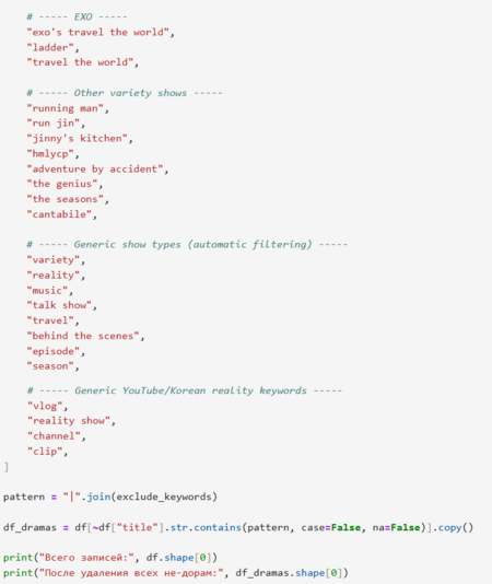 После очистки данных становится очевидно, что настоящие корейские драмы демонстрируют устойчиво высокое качество и занимают уверенные позиции в рейтинге. Топ перестаёт быть фанатским и превращается в реальный рейтинг сильнейших драматических сериалов 2000–2025 годов. На первое место выходят полноценные драматические сериалы, лидируют такие работы, как «When Life Gives You Tangerines», «Reply 1988», «My Mister»» — признанные критикой сильные сериалы с устойчивой репутацией. Топ стал гораздо более разнообразным по тематике: семейные и человеческие драмы, исторические проекты, сверхъестественные или подростковые сюжеты, психологические и социальные истории.