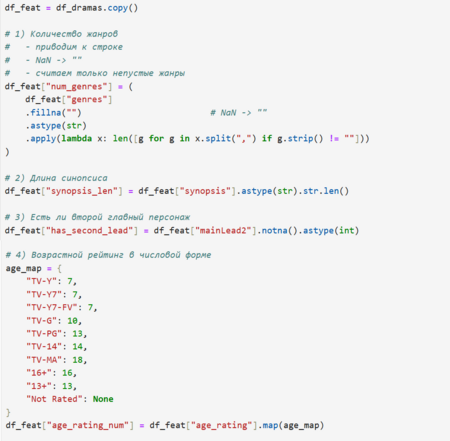 Я сделала: замену пропущенных значений, приведение типов данных (год выхода, длительность серий), разбиение жанров на списки, создание новых переменных: количество жанров, длина синопсиса, числовой возрастной рейтинг.
