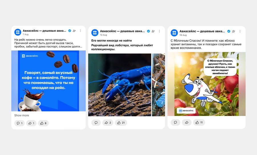 Сюжет постов примерно схож и включает себя рассказ про тайное общество, которое знает где искать дешевые авиабилеты. Под постами этих блогеров можно встретить комментарии сообщества Авиасейлс. Общая атмосфера притягивает новизной подхода к созданию контента, заставляет мониторить других медийных людей в надежде найти похожий контент, ну и, конечно, перейти в профиль социальных сетей сервиса, чтобы узнать подробности всей истории.