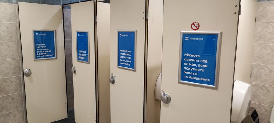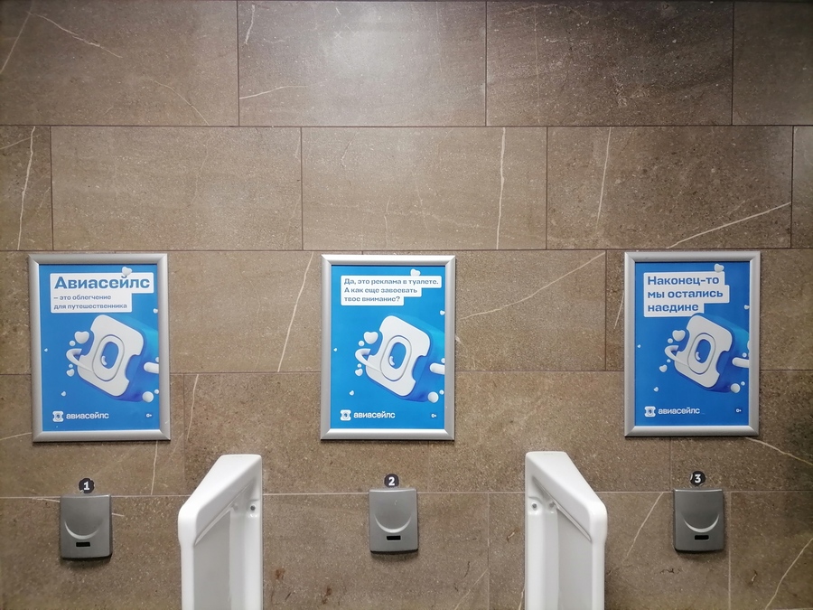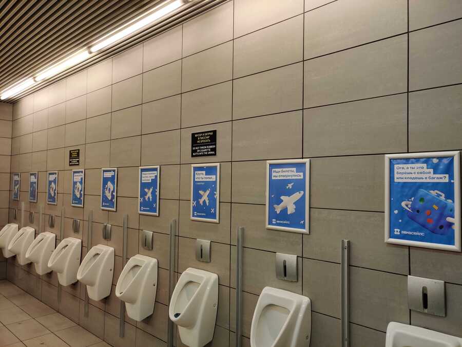 Продолжая тему провокаций в наружной рекламе, можно вспомнить недавнюю рекламную кампанию, которая вызвала огромный общественный диссонанс. Речь идет о рекламных плакатах, размещенных в кабинках туалетов в аэропортах семнадцати городов России.