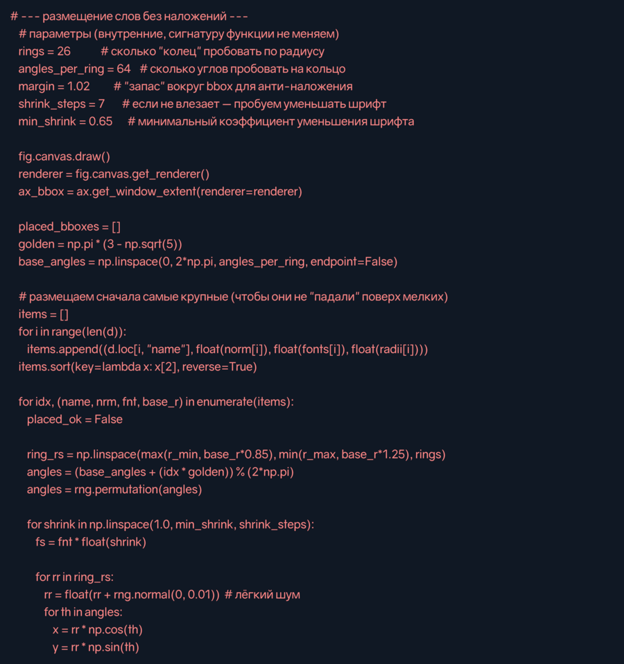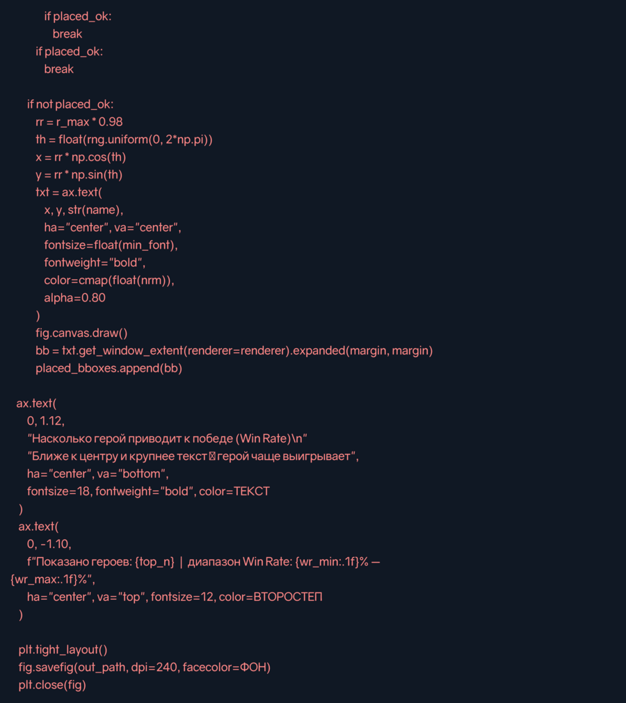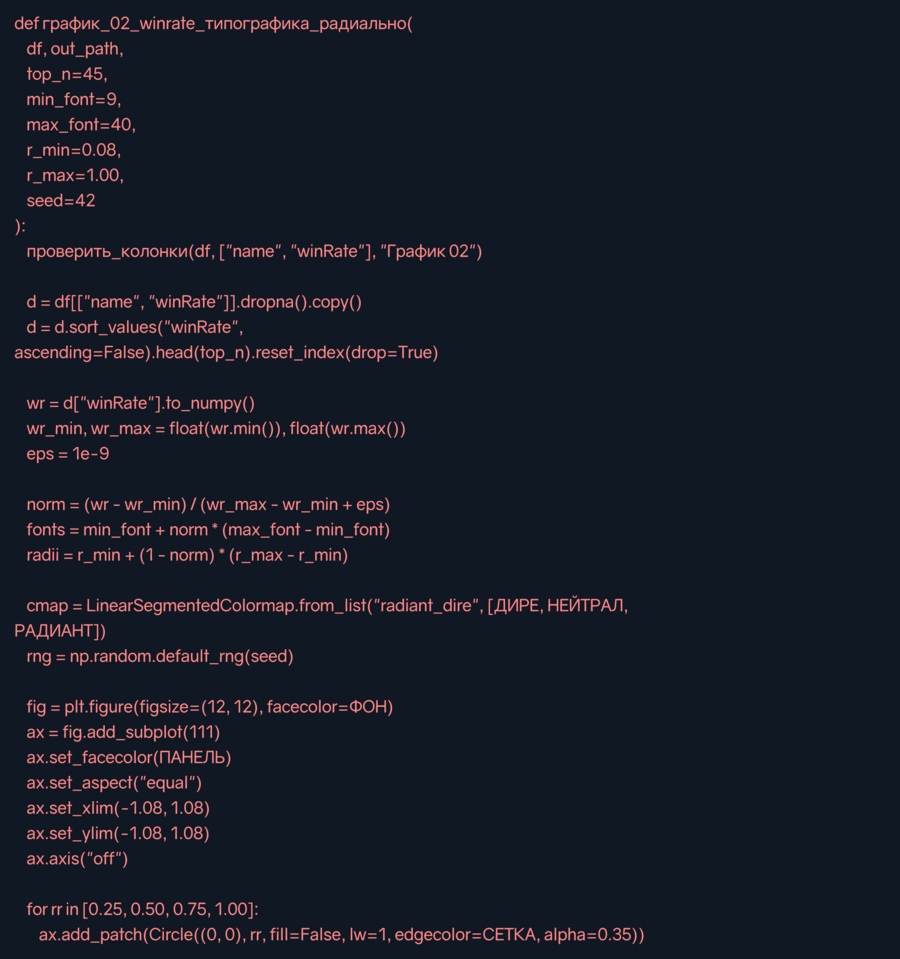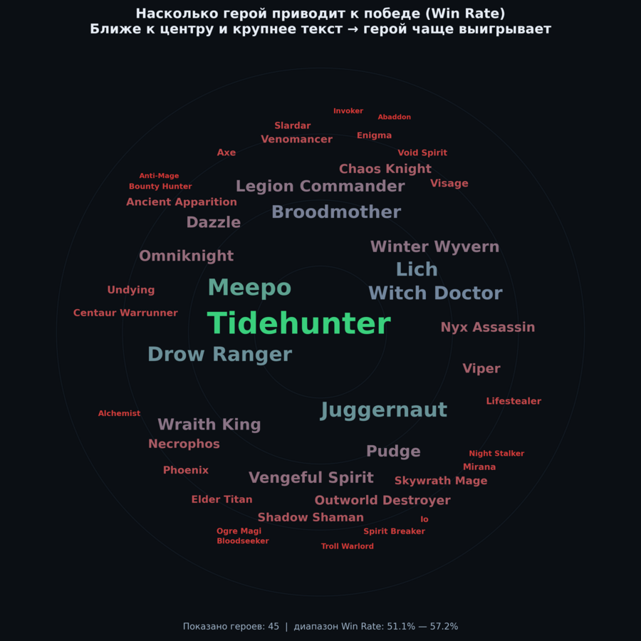 На графике имена героев располагаются по кругу. Чем ближе герой к центру и чем крупнее его имя, тем выше его Win Rate. Цветовой градиент от Dire к Radiant подчёркивает переход от более слабых значений к более сильным.