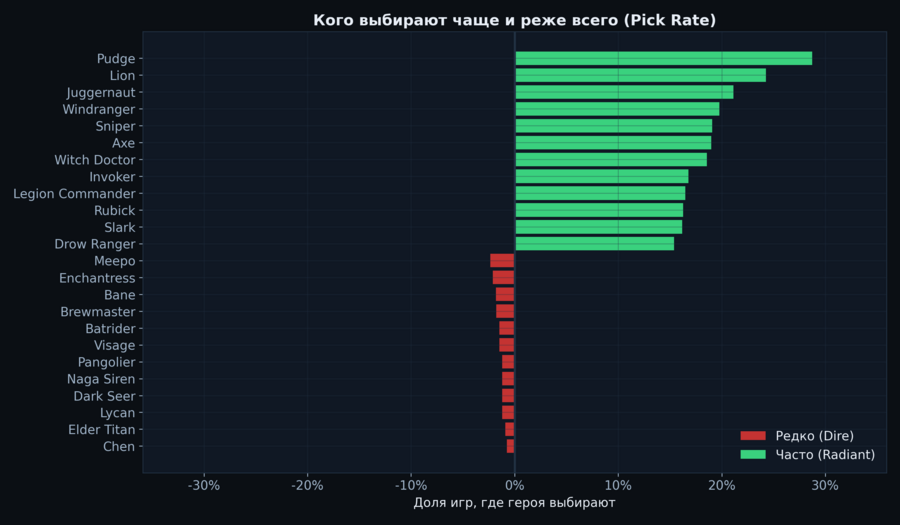 График показывает две группы героев: тех, кого выбирают чаще всего, и тех, кого выбирают крайне редко. Визуально это сделано через расхождение столбцов: популярные герои уходят вправо (Radiant-цвет), а редкие — влево (Dire-цвет). Такой приём помогает быстро увидеть контраст между «метовыми» героями и героями, которые почти не появляются в играх.