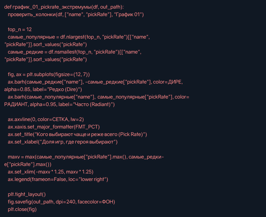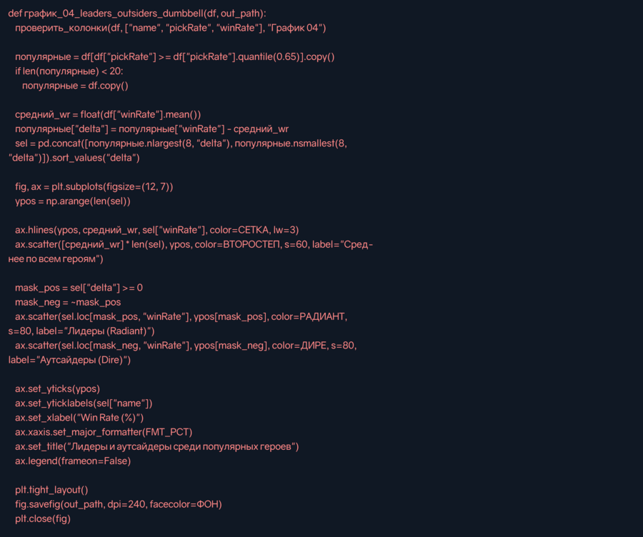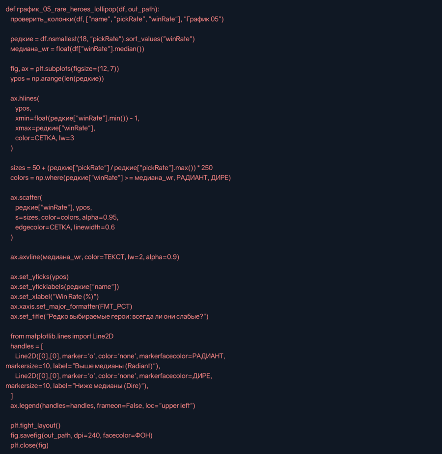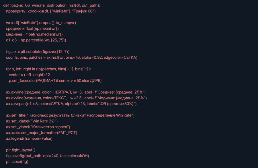 После подготовки данных и формулировки исследовательских задач был выполнен визуальный анализ — серия графиков, которая показывает мету и эффективность героев через разные «углы зрения».
