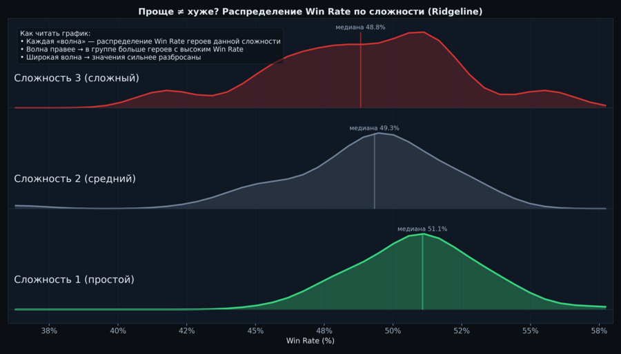 График сравнивает распределение Win Rate для героев трёх уровней сложности. Линия медианы помогает понять «типичный» Win Rate в группе, а форма волны показывает разброс. Это позволяет сравнить не отдельного героя, а поведение целого класса (простые/средние/сложные).