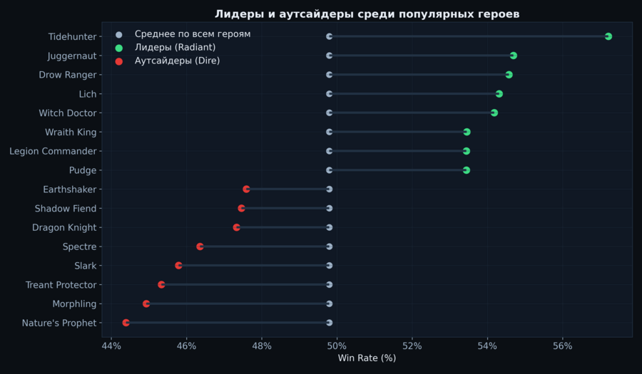 Среди достаточно популярных героев выбираются лидеры и аутсайдеры по Win Rate относительно среднего по датасету. Серая точка — средний Win Rate, цветная — значение героя. Линия показывает «насколько далеко» герой ушёл от среднего.