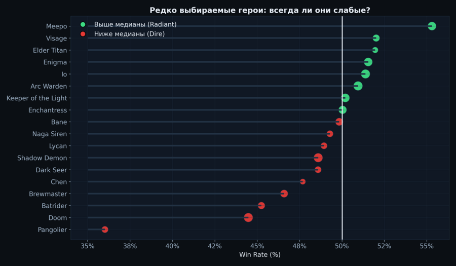 Берутся герои с самым низким Pick Rate и сравниваются по Win Rate. Леденец-маркер (кружок) показывает значение Win Rate, а размер маркера дополнительно намекает на величину Pick Rate (внутри редких).