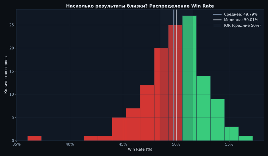 Гистограмма показывает, как распределены Win Rate по всем героям. Вертикальные линии отмечают среднее и медиану, а полоса IQR показывает диапазон «средних 50%» значений.