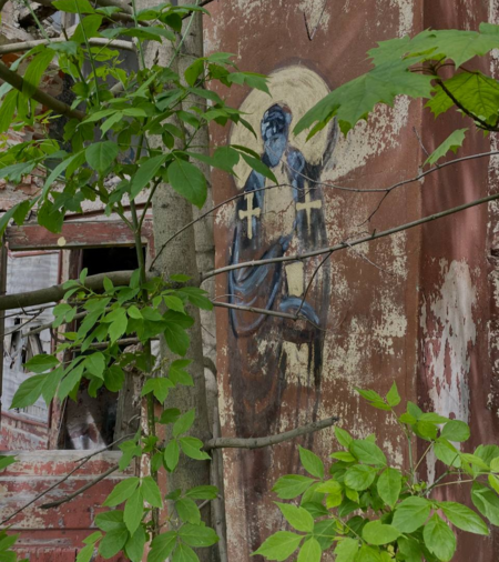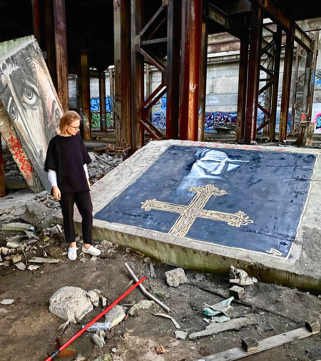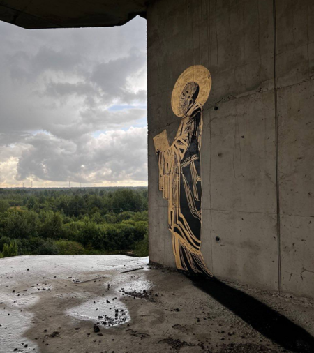 Так, например, в одной из руин художник поместила триптих с центральным образом богоматери на три рядом стоящих железных пластины.