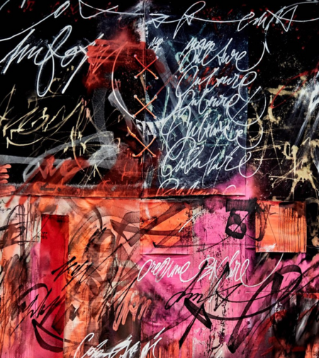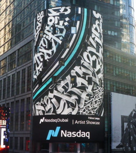 «…На биеннале в Шардже — это эмират рядом с Дубаем, где сконцентрированы образовательные и культурные активности. Там на меня мощно повлияли арабские каллиграфические эксперименты. А конце года в Дубае была моя большая персональная выставка, построенная вокруг переосмысления арабской каллиграфии в контексте современной кириллицы.»[3]