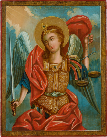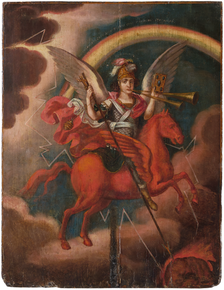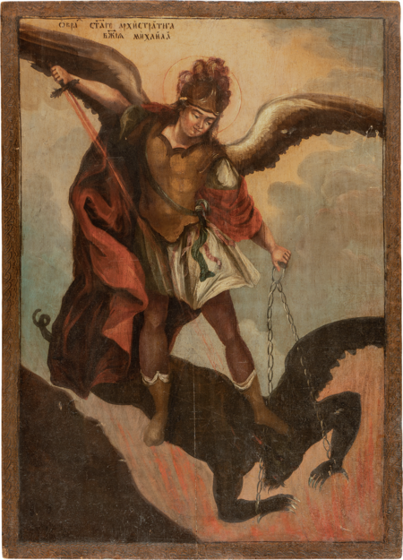 Слева: Архангел Михаил Воевода грозных сил По несохранившемуся оригиналу В. Л. Боровиковского (конец XVIII в.) Первая треть XIX в. Южная Россия (Полтавская губерния). Дерево, грунт, масло. 77,4 × 59,5 × 3 см