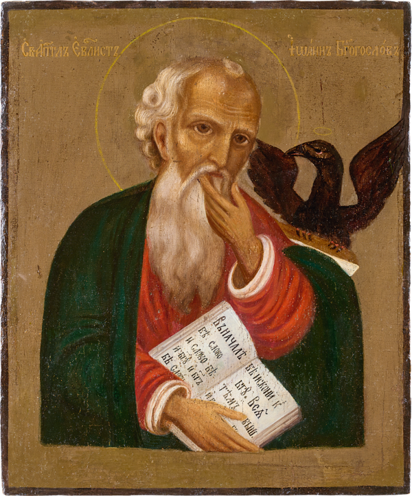 Слева: Апостол и евангелист Иоанн Богослов Конец XIX в. Российская провинция. Дерево, левкас, масло. 31,2 × 25,8 × 2,5 см
