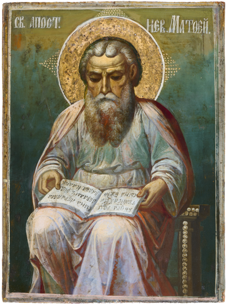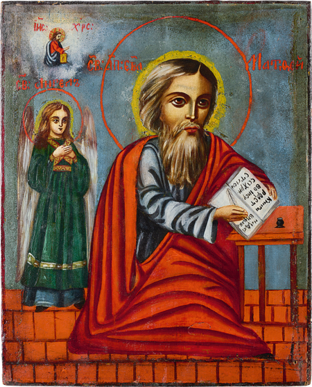 Справа: Апостол и евангелист Матфей Конец XIX в. Владимирские иконописные села (?). Дерево, левкас, масло, золото. 31 × 23 × 3 см