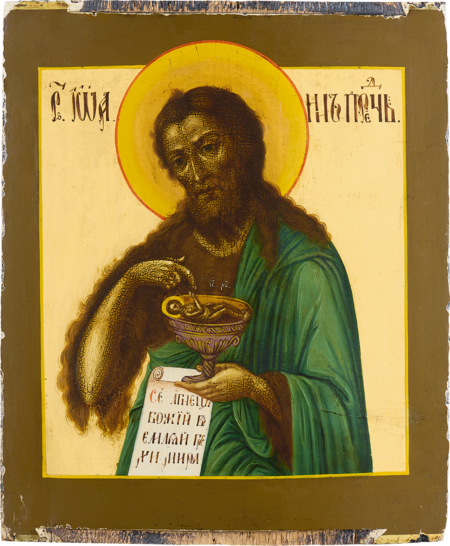 Справа: Святой Иоанн Предтеча / «Се Агнец Божий, вземляй грехи мира» Вторая половина XIX в., с поновлением ХХ в. Владимирские иконописные села. Дерево, левкас, темпера. 40,8 × 33,5 × 2,5 см