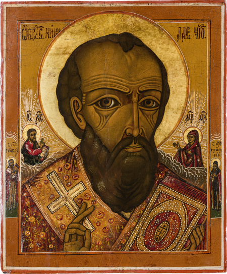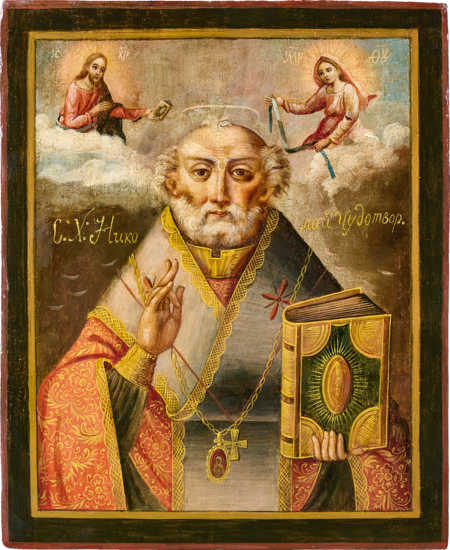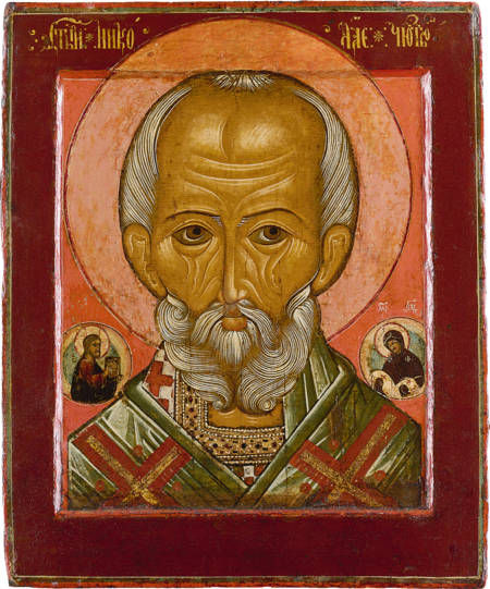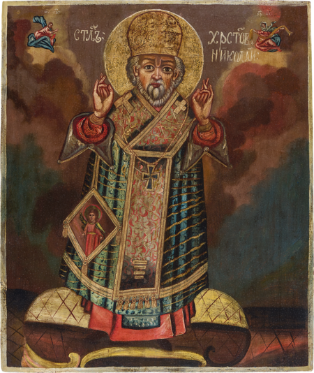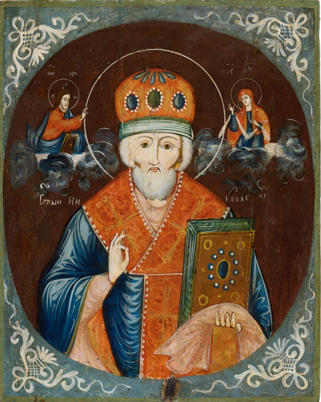 Справа: Святитель Николай Чудотворец Конец XIX — начало ХХ в. Владимирские иконописные села. Дерево, левкас, темпера. 39 × 32,5 × 2 см