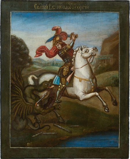Слева: Великомученик Георгий Победоносец Конец XIX в. Российская провинция. Дерево, грунт, масло; дублирование на новую основу. 46,5 × 36,9 × 3,5 см