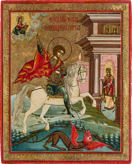 Справа: Великомученик Георгий Победоносец / Чудо святого Георгия о змие Середина XIX в. Мастер клинцовской (ветковской) традиции по синодальному заказу. Российская провинция (Калуга?). Дерево, левкас, темпера, золото, чеканка и гравировка по левкасу. 40 × 31,5 × 3,2 см