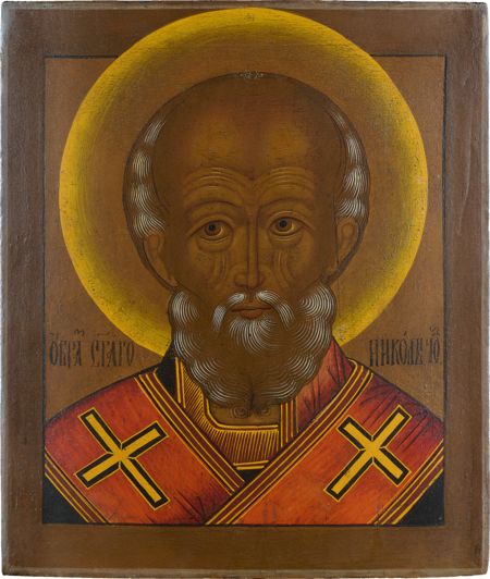 Справа: Святитель Николай Чудотворец Середина XIX в. Российская провинция. Дерево, левкас, смешанная техника. 31 × 24,9 × 2,5 см
