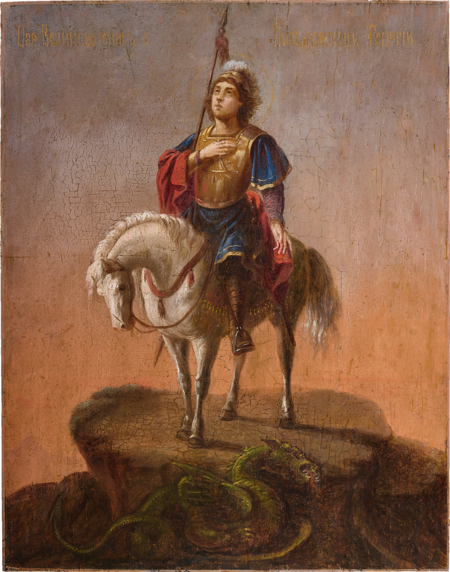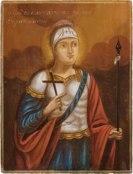 Справа: Великомученик Феодор Стратилат Первая четверть XIX в. Южная Россия. Дерево, левкас, масло. 31,8 × 24 × 2,8 см
