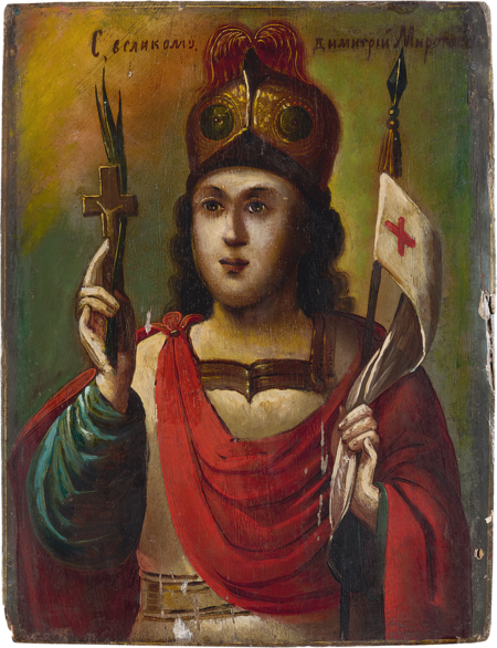 Слева: Великомученик Димитрий Солунский Первая половина XIX в. Слобода Борисовка Грайворонского уезда Курской губернии. Дерево, грунт, масло. 31,8 × 24 × 2,3 см