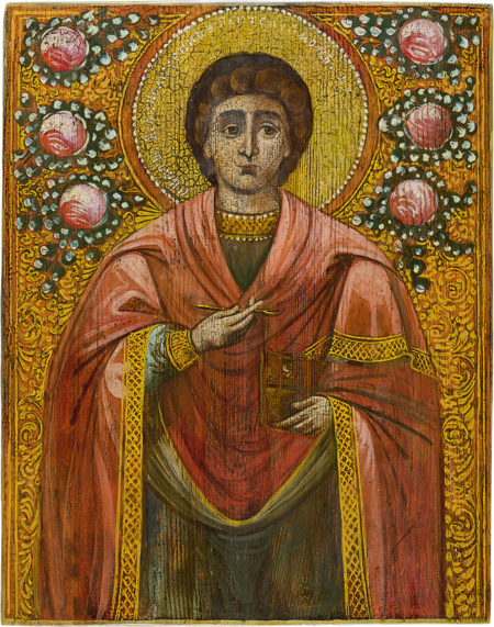 Справа: Великомученик и целитель Пантелеимон Вторая половина XIX в. Юго-Западная Россия (Стародубье). Дерево, масло. 51,7 × 40,5 × 2 см