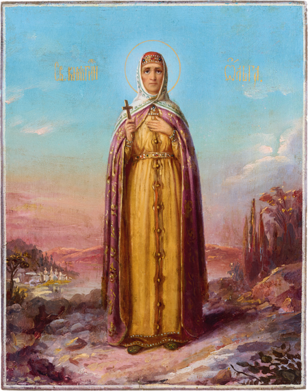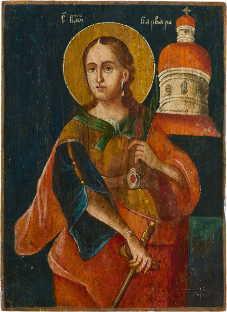 Справа: Великомученица Варвара Конец XIX — начало ХХ в. Слобода Борисовка Грайворонского уезда Курской губернии. Дерево, грунт, масло. 33,8 × 24,8 × 2 см
