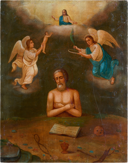 Слева: Успение преподобного Иоанна Многострадального Середина — третья четверть XIX в. Киев. Дерево, левкас, масло. 37,2 × 29,3 × 1,9 см
