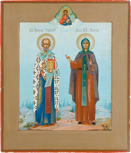 Слева: Святитель Николай Чудотворец и преподобная Мария Конец XIX — начало XX в. Палех. Дерево, ковчег, левкас, смешанная техника, золото; бархат. 31,5 × 27 × 2,7 см