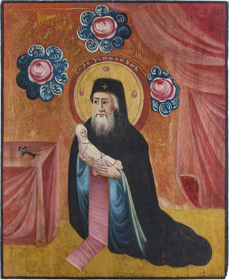 Слева: Преподобный Стилиан Пафлагонский Вторая половина XIX в. Юго-Западная Россия (Стародубье). Дерево, масло. 52,8 × 43,3 × 2,3 см