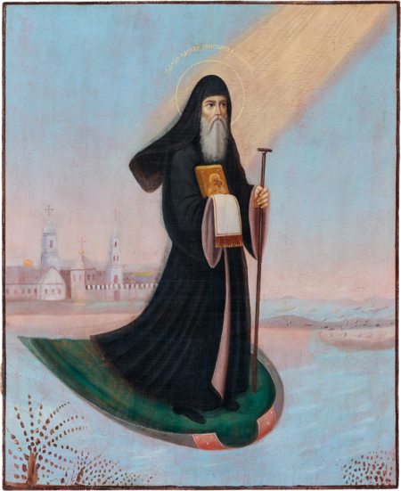 Справа: Праведный Симеон Верхотурский Последняя четверть XIX в. Мастерская. Николаевского мужского монастыря, Верхотурье. Дерево, левкас, масло, золото. 44,7 × 35,3 × 2 см