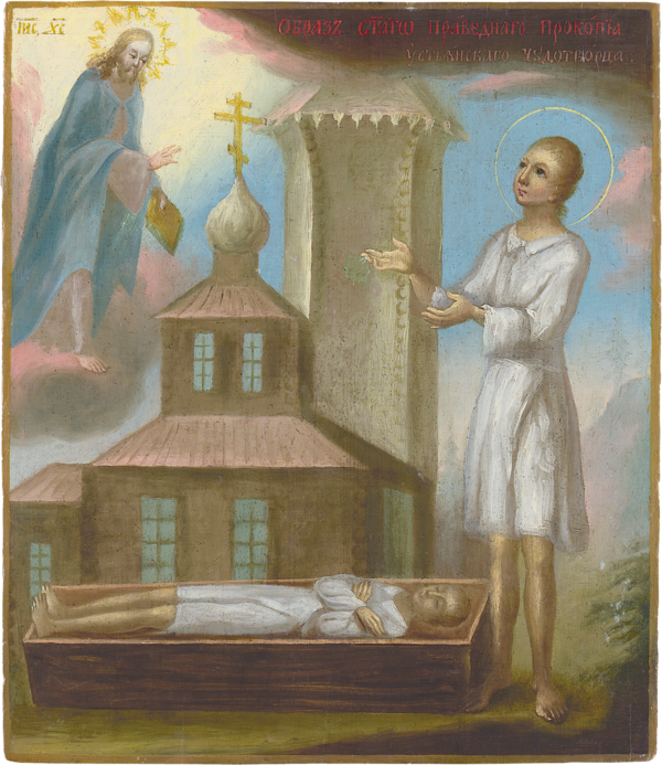 Слева: Праведный Прокопий Устьянский Третья четверть XIX в. Архангельская губерния. Дерево, грунт, смешанная техника. 33,3 × 28,7 × 2,7 см