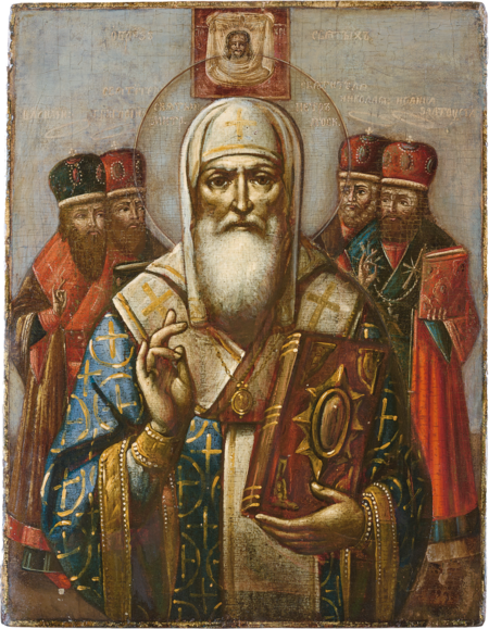 Справа: Избранные святители: Петр, митрополит Московский, Василий Великий, Григорий Богослов, Николай Чудотворец, Иоанн Златоуст Первая треть XIX в., с поновлением конца XIX — начала ХХ в. Российская провинция. Дерево, левкас, масло. 35,3 × 26,6 × 3 см