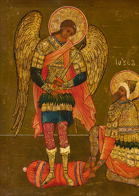 Слева: Явление архангела Михаила Иисусу Навину Начало ХХ в. Москва (?). Дерево, ковчег, левкас, смешанная техника, золото. 31 × 26,2 × 2,4 см