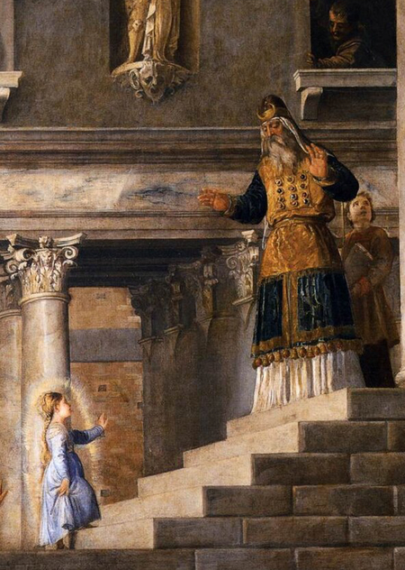 В это фреске Тициан использовал интересный прием. Поднятая рука девушки выполнена рельефом, а не просто написана на фреске.