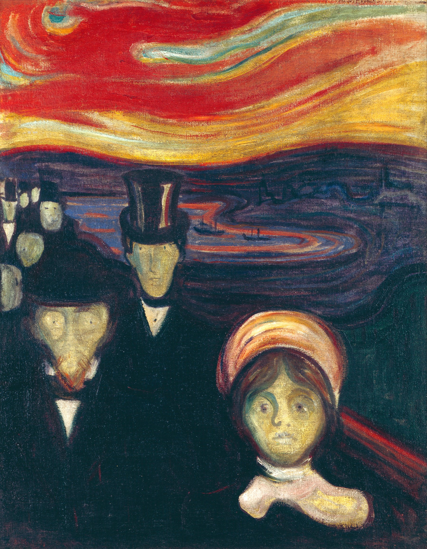Сюжет картины перекликается с «Криком»: та же набережная, та же тревожная атмосфера, но здесь на передний план выходит группа людей, а не одинокая фигура. Лица людей кажутся масками, воплощением безжизненности и страха, это коллективная тревога, а не личные страдания. Мунк создает этот образ, используя упрощенные контуры и контрастные цвета, создающие визуальное напряжение. Мы видим, что искажена и деформирована даже природа: кроваво-красное пылающее небо, вода и волнистые силуэты гор не подчиняются законам перспективы — они становятся выражением внутреннего волнения, ощущения дисгармонии. «Век вывихнут».