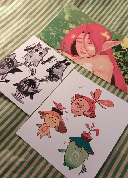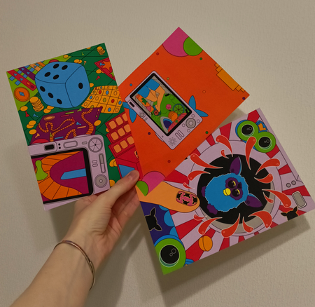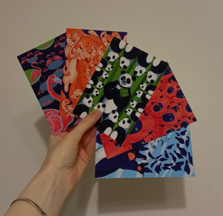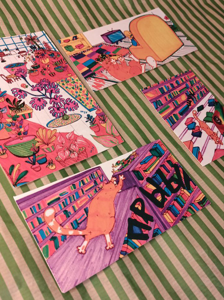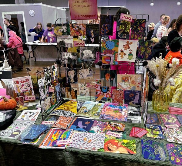 На маркете был представлен мой авторский мерч: открытки, закладки, напечатанные и сшитые вручную комиксы.