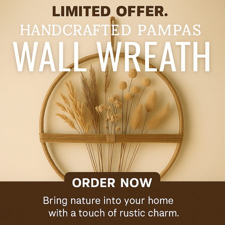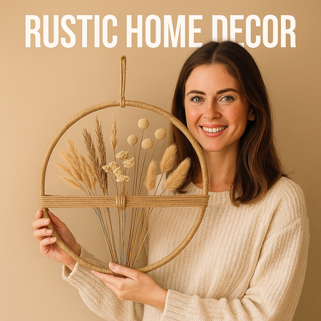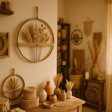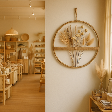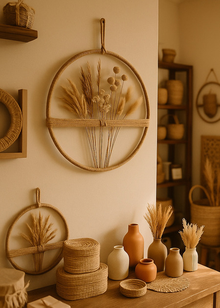 1. Минималистичное настенное панно из различных сухоцветов круглой формы с простой рамой из джутовой верёвки. По середине диаметра перевязано джутом. Мягкий рассеянный свет.