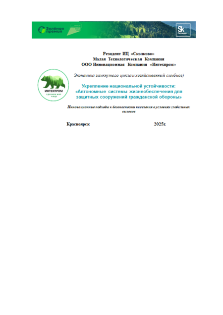 Краткое описание Вашей деятельности: Замкнутые системы жизнеобеспечения (ЗСЖО) нового поколения Принцип: Максимальная регенерация ресурсов внутри замкнутого объема, минимизация зависимости от внешних источников. Утилизация отходов: Комплексная переработка твердых и жидких бытовых отходов, включая биоотходы. * Регенерация воды: Возврат до 90% воды в оборот системы, в том числе из фекалий и других стоков.