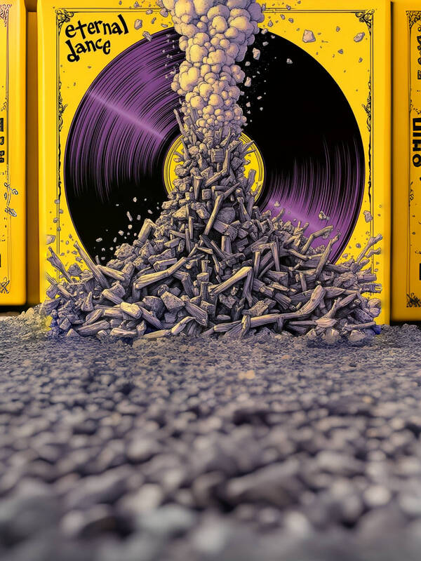 create a shop for a crematory that turns your ashes into a vynyl record; the place is made for punks; opem-minded; brick pale yellow walls; bright modern interrior; posters saying ' eternal dance'; different posters of people with dissolved effect; vynyl recorders on the tables